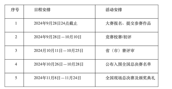 2024年整体赛事工作部署,赛程分为:校级初赛、省(市)赛评审及全国总决赛三个阶段;各赛程设置及具体安排详见附件1《竞赛指南》。